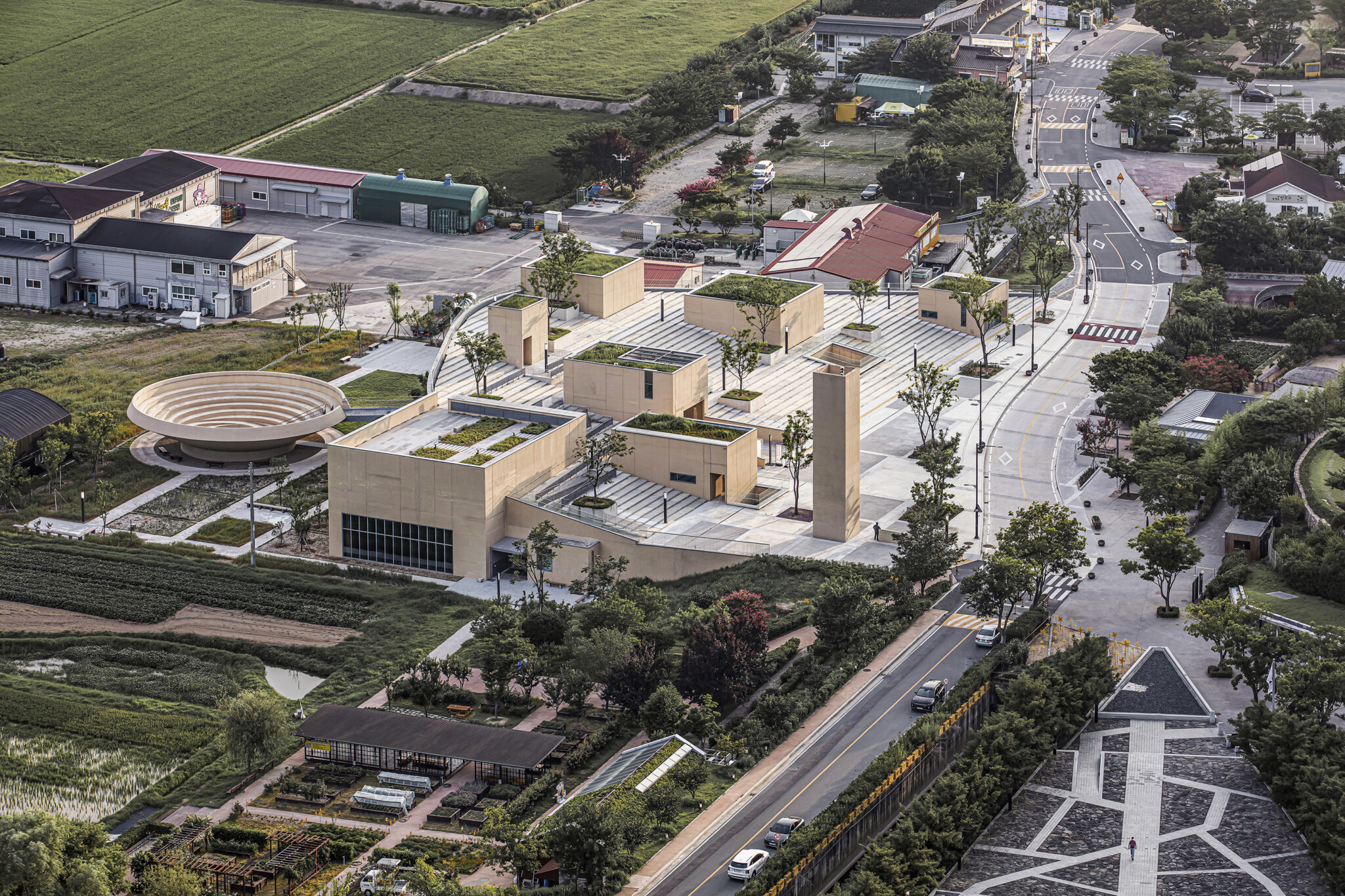 노무현 전 대통령 고향 봉하마을에 연면적 1,200평 규모 기념관을 설계하는 일이 주어졌다. 주어진 면적을 지상으로 올리면 기존 마을 건물들에 비해 과하게 큰 볼륨이 될게 자명했다. 기능을 충족하면서도 볼륨이 겉으로 드러나지 않도록 하는 것이 고민의 시작이었다. 대지 내 존재하는 4m의 단차를 이용하여 전시 기능 대부분을 지하로 배치하여 체적을 감췄다. 그 상부를 경사진 계단광장으로 하여 마을에 부족한 공공 광장의 역할을 충족하도록 계획했다. 광장 위로는 일부 시설만이 주변 건물과 비슷한 크기로 솟아 올라와 마을의 주 도로에서 볼 때 위화감 없는 스케일의 풍경을 형성하도록 했다. 풍경으로서의 건축이다.