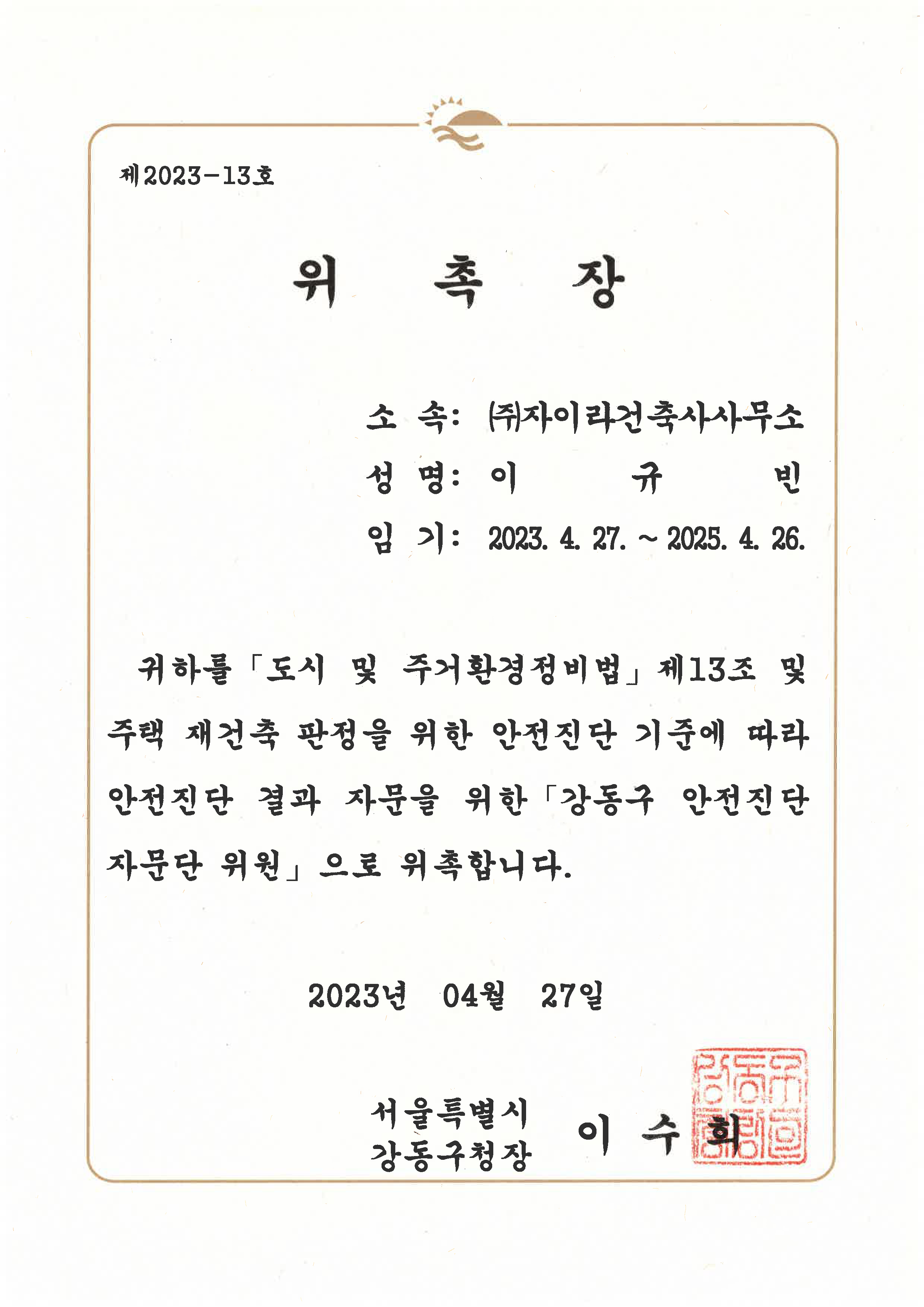 이규빈 대표가 강동구 재건축 안전진단 자문단 위원으로 위촉되었습니다. 위촉기간은 2년으로 강동구 내 공동주택 재건축 현장조사를 통해 안전진단 실시 여부를 판단하고 조건부 재건축으로 판정된 경우 공공기관에 적정성 검토 의뢰 여부 판단 하는 등의 업무를 수행하게 됩니다.