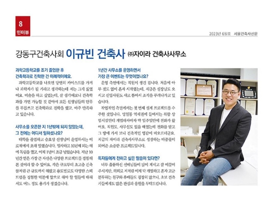 이규빈 대표가 서울건축사신문과 인터뷰를 가졌습니다. 서울건축사신문은 서울특별시건축사회에서 관내 건축사를 대상으로 매달 발간하는 신문입니다. 이번 6월호에서는 특별히 이규빈 대표와 자이라건축, 그리고 명일동 복합상업시설 <shopping landscape> 이야기를 다뤄주셨습니다. 취재에 수고해주신 권태숙 기자님과 추천해주신 강동구건축사회 이광호 회장님께 감사드립니다.