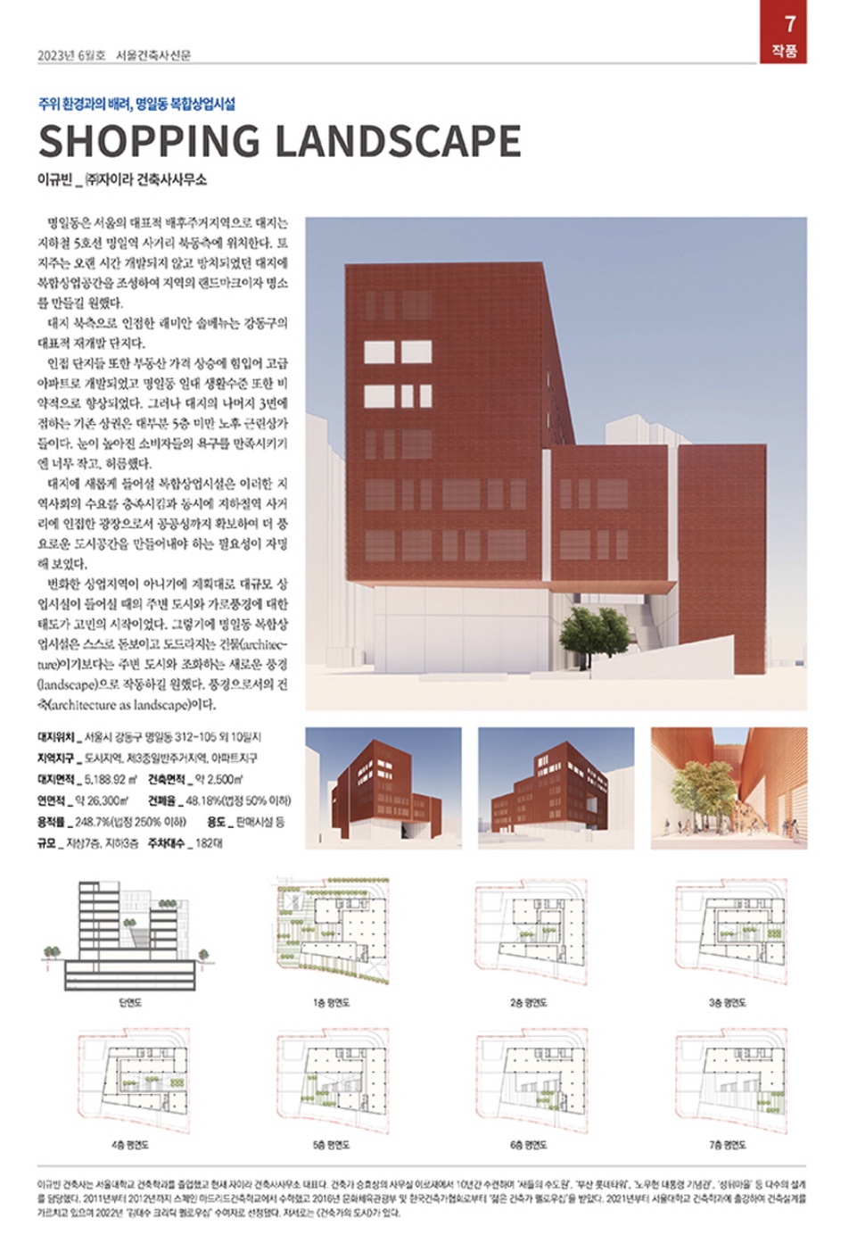 이규빈 대표가 서울건축사신문과 인터뷰를 가졌습니다. 서울건축사신문은 서울특별시건축사회에서 관내 건축사를 대상으로 매달 발간하는 신문입니다. 이번 6월호에서는 특별히 이규빈 대표와 자이라건축, 그리고 명일동 복합상업시설 <shopping landscape> 이야기를 다뤄주셨습니다. 취재에 수고해주신 권태숙 기자님과 추천해주신 강동구건축사회 이광호 회장님께 감사드립니다.