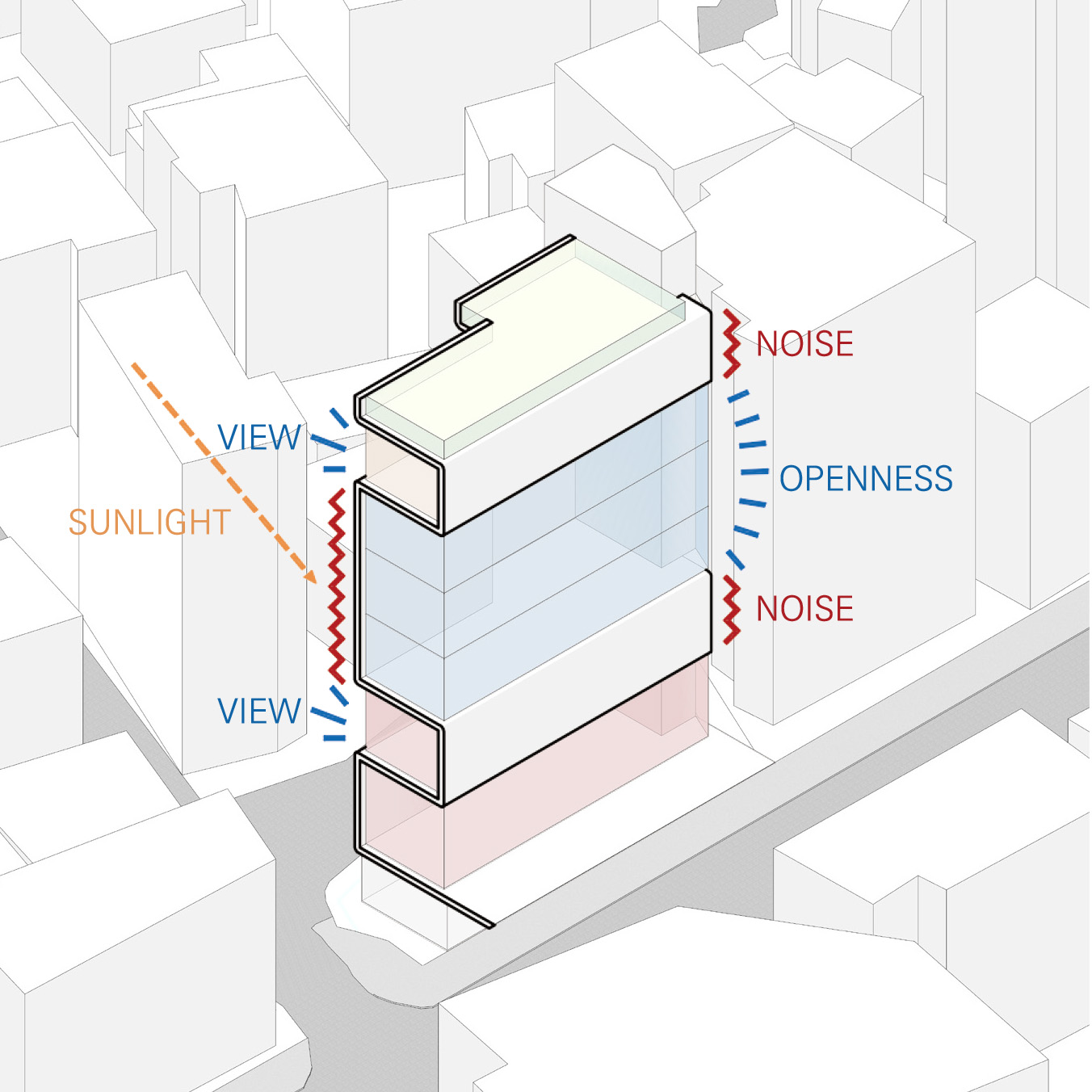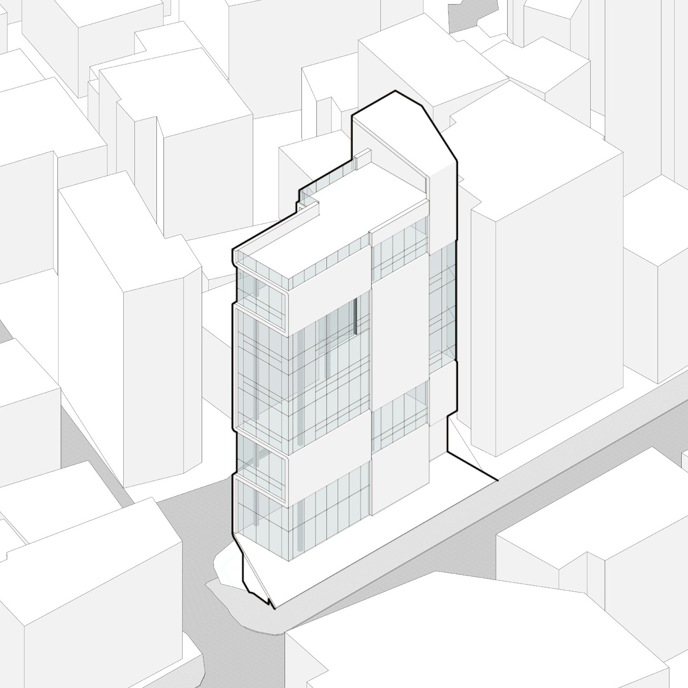 The site is located at the southern end of Gwangjin Bridge, on a trapezoidal plot that had long been left undeveloped. The road in front, known as "Cheonho-dong Tool Street," is somewhat bustling, but once the building is completed, it will offer a picturesque view of the Han River framed by Achasan Mountain. The front and rear roads, with a 3.6-meter elevation difference, allow for easy underground parking without additional excavation. The client decided to build an office on this site, aiming to minimize construction costs and time by utilizing the existing terrain for a quick move-in. Due to the nature of neighborhood commercial facilities, the floor plan was significantly influenced by regulations and economic factors, requiring careful consideration of the façade and material expression.