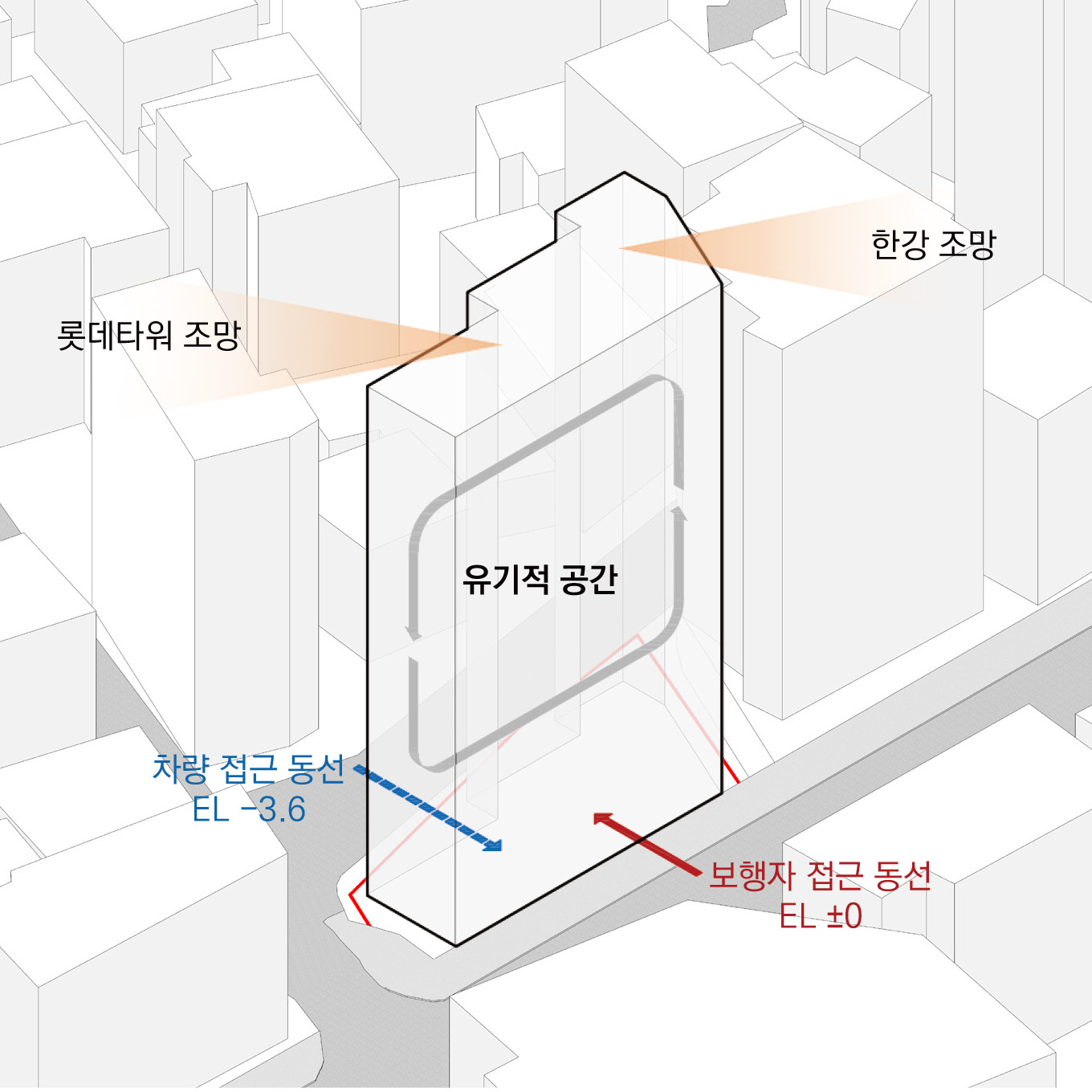 대지는 광진교 남단에 위치한 사다리꼴 형상의 땅으로 오랜 시간 개발되지 못하고 나대지로 방치되었던 곳이었다. ‘천호동 공구거리’라 이름 붙은 앞길의 풍경은 다소 번잡했지만 건물이 올라가면 분명 멀리 아차산을 배경으로 한강 물의 들고나는 풍경이 그림처럼 바라보일게 분명했다. 전면도로와 3.6m 단차를 가진 이면도로는 별도로 땅을 더 파지 않고도 지하 주차장으로 쓰이기 용이한 구조였다. 이곳에 사옥을 짓기로 결심한 건축주는 지형을 그대로 활용하여 공사비용과 기간을 최대한 줄여 빠른 시간 내 입주를 희망했다. 근린생활시설의 특성상 평면적으로는 법규와 경제적 논리가 많은 것을 결정할 수밖에 없기에 입면과 재료적 표현에서 더 많은 고민을 필요로 했던 프로젝트였다.