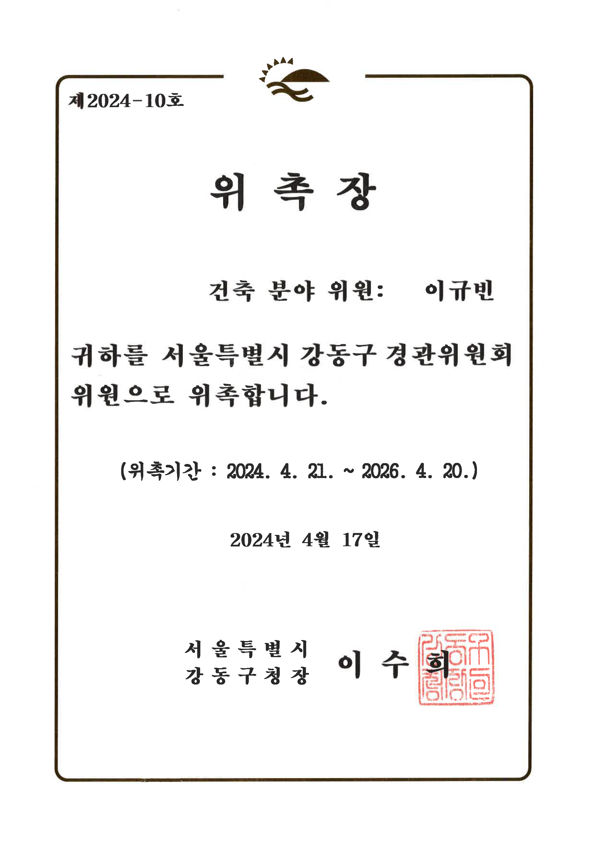 이규빈 대표가 강동구 경관위원회 위원으로 위촉되었습니다. 위촉기간은 2년으로 『경관법』 제29조 및 『서울특별시 강동구 경관조례』 제25조에 의거하여 경관 관련 심의·자문 및 공공디자인 진흥위원회 역할 대행 등의 업무를 수행하게 됩니다.