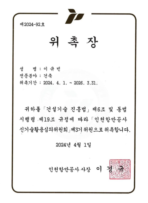 이규빈 대표가 인천항만공사 기술자문위원회 및 신기술활용심의위원회 위원으로 위촉되었습니다. 위촉기간은 2년으로 한국어촌어항공단에서 발주하는 건설공사의 입찰·계약을 위한 기술자문 및 신기술활용의 심사·검토 등을 수행하게 됩니다.