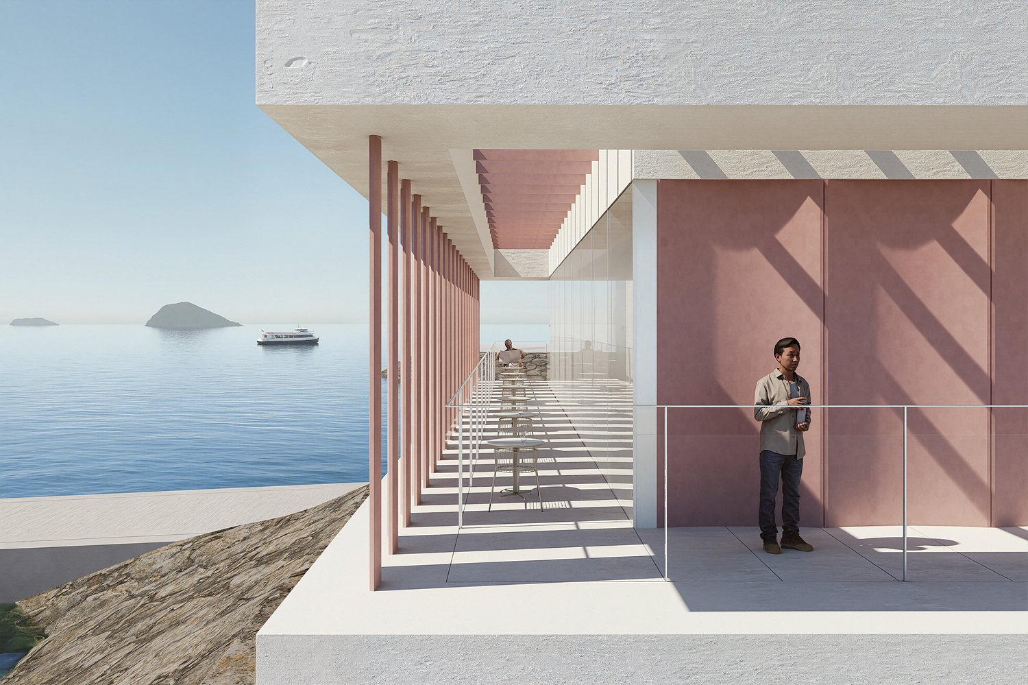전면의 계단광장과 2층 테라스는 승선객의 대기, 방문객의 휴식, 주민의 체류와 조망이 겹쳐지는 공공적 장치로 작동하며, 터미널을 단순한 교통시설이 아닌 지역의 일상과 풍경을 담는 열린 플랫폼으로 확장시킨다.