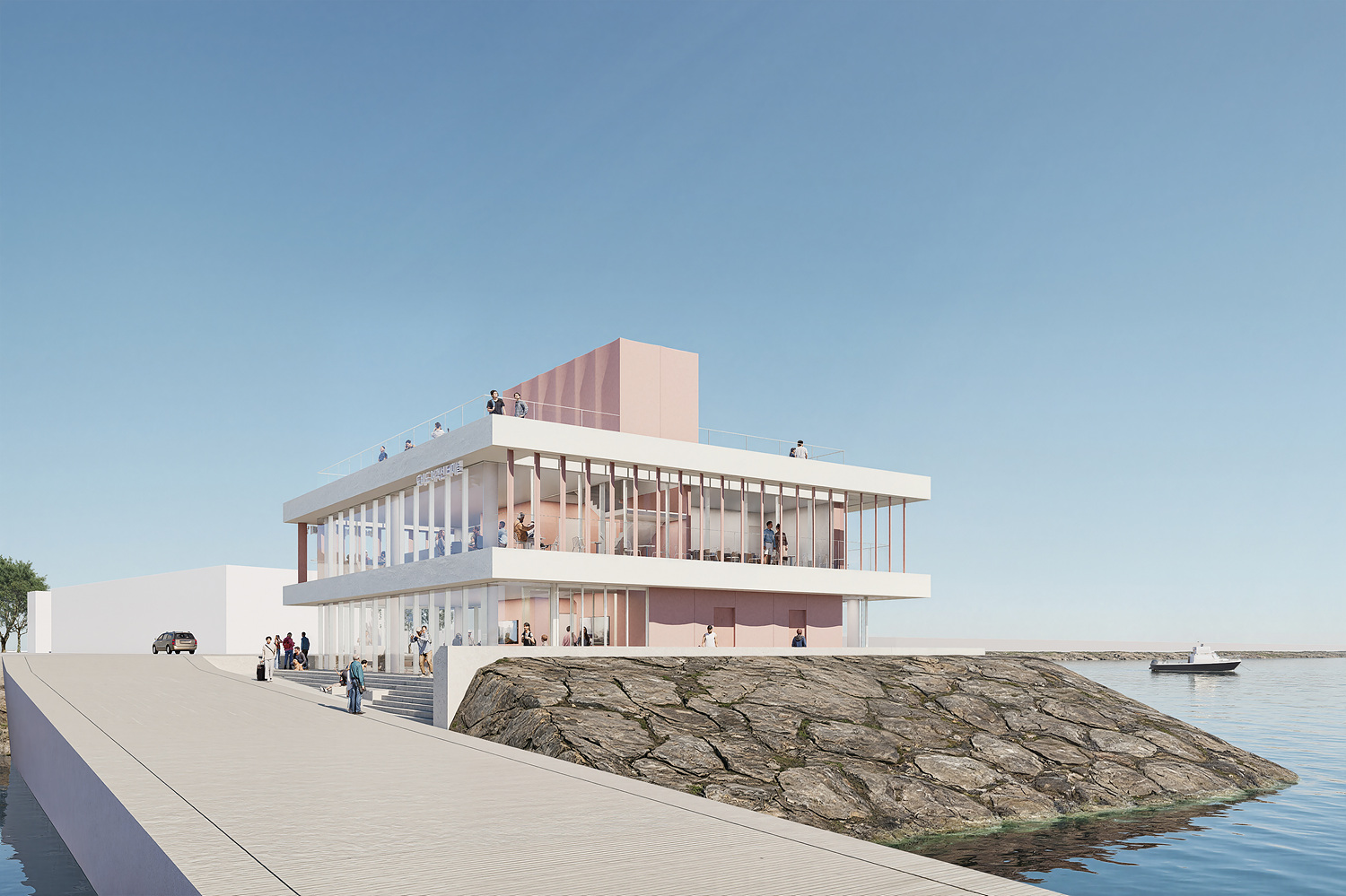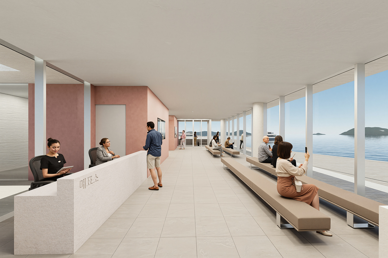 투명 로이유리, 수직 루버, 노출콘크리트와 컬러 패널의 조합은 바닷가의 빛과 바람, 풍하중과 일사에 대응하면서 수평으로 열린 풍경의 인상을 강화한다. 이 건축은 배를 타기 위해 잠시 머무는 시설을 넘어, 바다와 도시, 이동과 체류, 기능과 풍경이 겹쳐지는 ‘수평 풍경의 플랫폼’으로 완성된다.