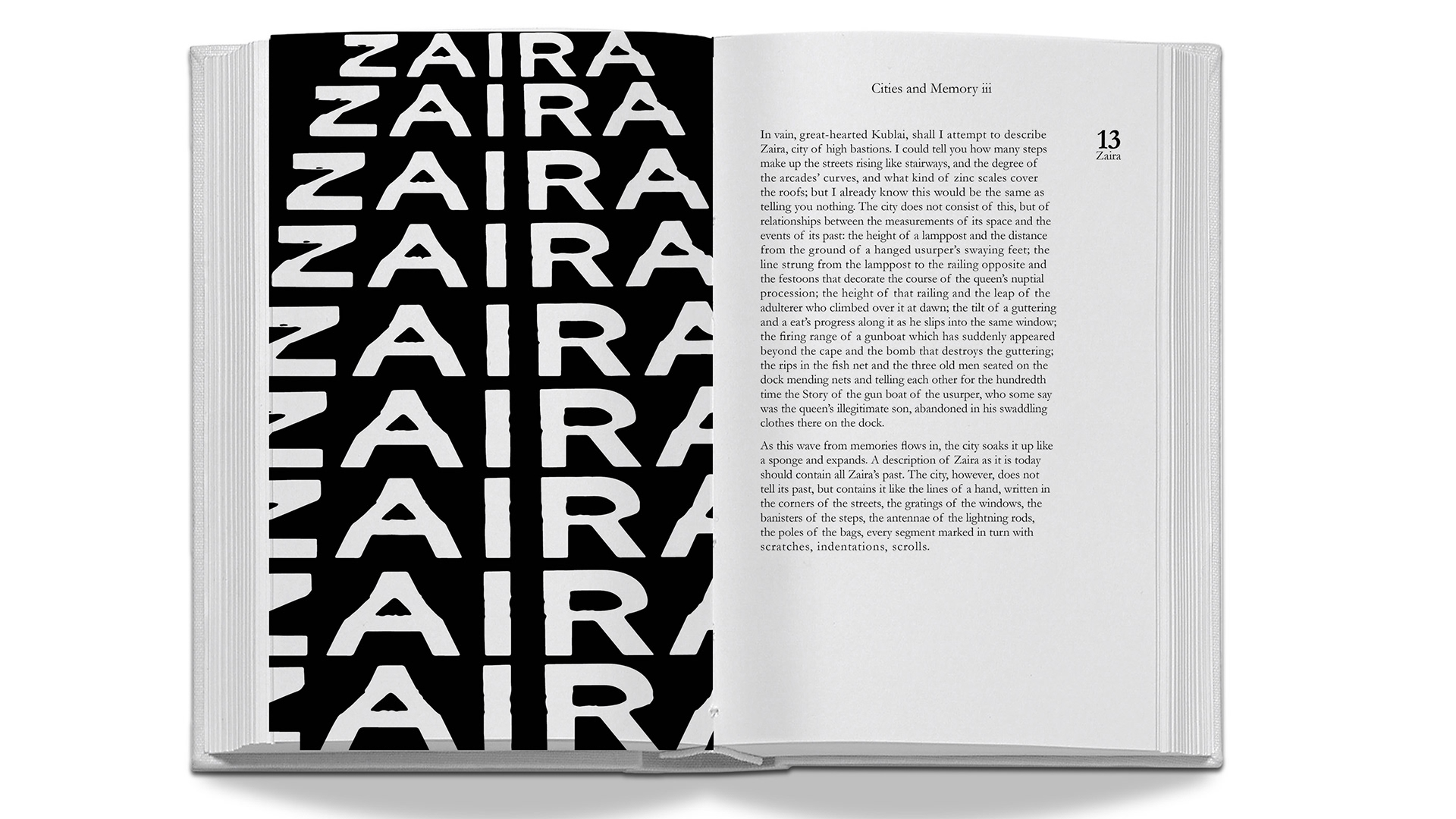 ...... 이 도시에 계단식으로 만들어진 길들의 계단 수가 얼마나 많은지, 주랑의 아치들이 어떤 모양인지, 지붕은 어떤 양철판으로 덮여 있는지 폐하께 말씀드릴 수 있을 것입니다. 그러나 이런 것들을 말씀드리는 게 아무것도 말씀드리지 않는 것과 다를 게 없다는 것을 저는 이미 알고 있습니다. 도시는 이런 것들로 이루어지는 게 아니라, 도시 공간의 크기와 과거 사건들 사이의 관계로 이루어지는 것이기 때문입니다.